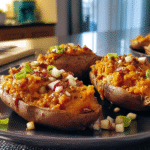 Apple Spiced Stuffed Sweet Potatoes are a delicious dish made by baking sweet potatoes and filling them with a mixture of apples, spices, and often other ingredients like nuts or dried fruits. The combination of sweet and savory flavors makes this dish unique and enjoyable, perfect for any season but especially during fall when apples are abundant.
