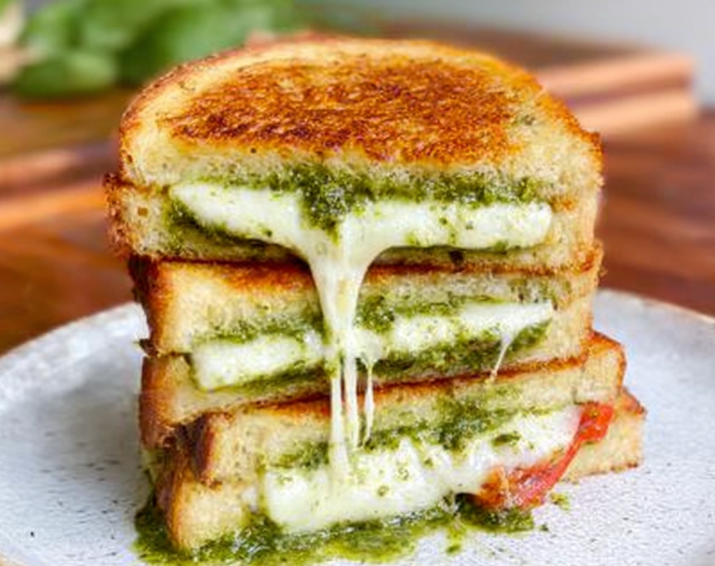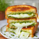 Indulge in the Best Pesto Grilled Cheese, where creamy melted cheese meets vibrant basil pesto, all nestled between crispy, golden bread for a comforting delight.