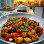 Chicken with Thai Basil is a vibrant and aromatic stir-fry dish that beautifully marries tender chicken thighs with the fresh, peppery notes of Thai basil. Packed with the flavors of garlic, chili, and savory sauces, this dish is quick to prepare and perfect for both weeknight dinners and impressing guests. Serve it over jasmine rice or alongside stir-fried vegetables for a complete meal that will transport you straight to the bustling streets of Thailand.