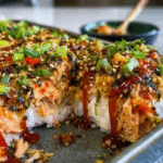 Indulge in a delightful Easy Spicy Salmon Sushi Bake, featuring creamy salmon and fluffy rice, all baked to perfection for a comforting and flavorful dish.