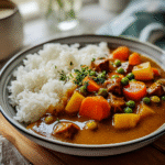 Experience a warm, comforting bowl of vegan Japanese curry rice, brimming with tender vegetables and rich flavors that will delight your senses.