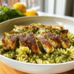 Pesto Pasta with Parmesan Chicken Perfection is a flavorful dish that combines al dente pasta tossed in homemade pesto sauce and topped with succulent grilled chicken seasoned perfectly. The creamy texture of the Parmesan cheese enhances every bite while bringing out the vibrant flavors of fresh basil in the pesto.